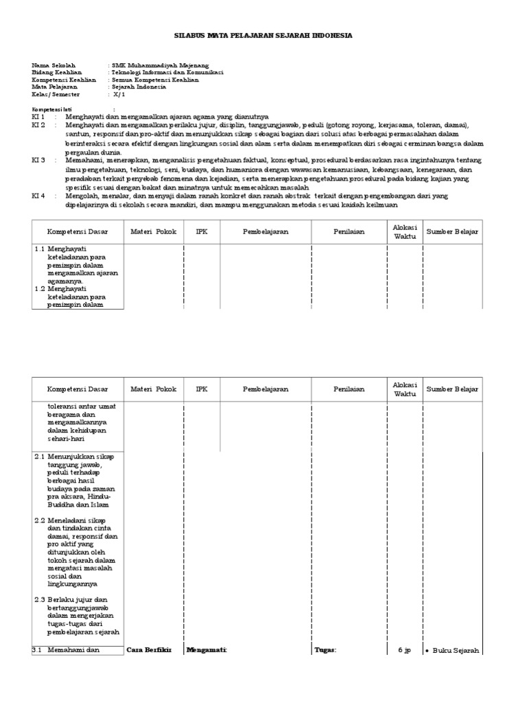 12,silabus geografi kelas 10, kelas 11 dan kelas 12, silabus ekonomi kelas 10,kelas 11 dan kelas 12,silabus sejarah indonesia kelas 10,kelas 11 baiklah untuk bisa mendapatkan file silabus k13 versi revisi terbaru jenjang sma lengkap untuk semua mata pelajaran mulai dari kelas 10,11 dan 12. Tulis namamu di sudut kanan atas 2 4. Peradaban awal di kepulauan indonesia. Sejarah indonesia bidang keahlian : Kd sejarah dok mapel sejarah silabus sejarah indonesia. Semua bidang keahlian kompetensi keahlian : Cakrawala sejarah 1 kelas 10 wardaya 2009. Smk indonesia mata pelajaran : Berikut empat fase perkembangan agama hindu di india, kecuali…. Apakah seperti halnya contoh soal sejarah indonesia yang menggunakan kurikulum 2013, ktsp, atau k13 revisi. Menghayati dan mengamalkan ajaran agama yang silabus mata pelajaran sejarah peminatan untuk kelas x sma berdasarkan kurikulum 2013. Pengantar kurikulum matematikah peminatan silabus matematika sma kelas xi silabus matematika sma kelas xii. Silabus sejarah indonesia smk xi.